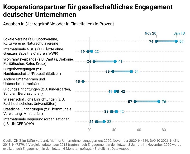 Zivilgesellschaftliche Organisationen vor Ort sind wichtige Partner* innen für das Engagement der Unternehmen. Egal wie groß oder klein Unternehmen sind, sie arbeiten alle besonders gerne mit örtlichen Vereinen zusammen (83 Prozent). Große Unternehmen kooperieren außerdem gerne mit großen oder internationalen Organisationen, wie zum Beispiel Caritas, Diakonie, Paritätischer, Ärzte ohne Grenzen, Save the Children oder World Wide Fund For Nature (WWF). Mit Bürger-Initiativen arbeitet die Hälfte der Unternehmen zusammen.