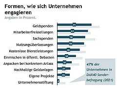 Insgesamt ist das Engagement der Unternehmen in Deutschland während der Coronakrise 2020 deutlich zurückgegangen. Das mag daran liegen, dass sich viele Unternehmen im Bereich Sport, Event, Kunst und Kultur engagieren, was während der Coronakrise kaum möglich war. Zudem mussten Unternehmen viele neue Herausforderungen meistern, wie Hygiene-Maßnahmen, Geschäftsschließungen oder die plötzliche Umstellung auf Home-Office. Zitat eines Unternehmensvertreters: »In der Corona-Krise […] haben wir uns weniger auf die Außenwelt konzentriert, sondern uns um unsere Mitarbeiter und deren Sorgen gekümmert.«